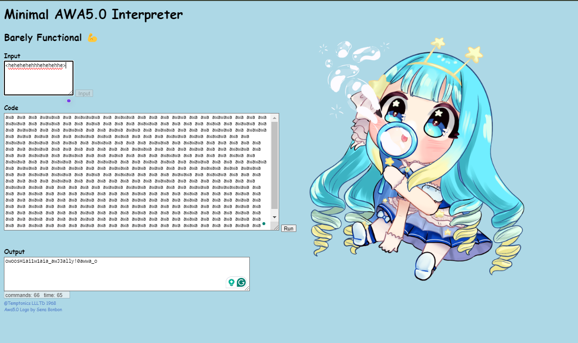 We are given a Awaaaaaaaa.png (not the one above) and a Awwwww.txt which consisted of awa5.0 code. The png file was running the same code given to us in the online Awa5.0 interpreter. The input was supposedly the flag ( hidden ) and output was visible, which looked like the shuffled flag.