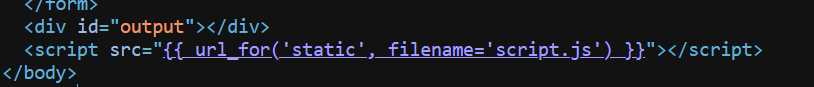 Usually the format {{url_for('static', filename='script.js')}} would return the url of the script.js file (usually like /static/script.js). But in this case it was not being implemented. This is also a part of Jinja2. So if you have knowledge on Jinja2 / Flask you could easily identify this.